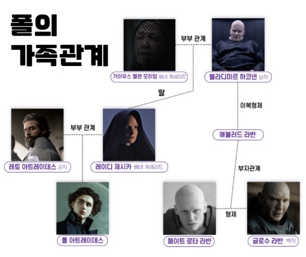 폴의 어머니인 제시카는 블라디미르 하코넨과 모히암과의 사이에서 난 딸이었고, 따라서 하코넨은 폴의 외할아버지입니다. 로타 라반과 글로수라반은 하코넨의 조카이며 폴과는 5촌 관계가 됩니다. 폴은 베네 게세리트가문, 하코넨 가문 그리고 아트레이데스 가문의 모든 피를 이어 받았습니다.