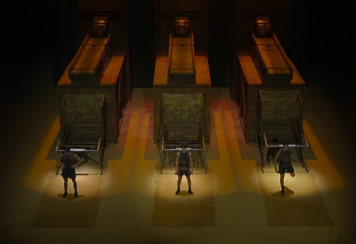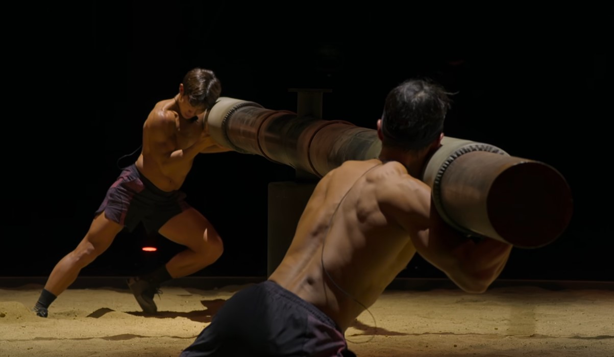 참가자들은 거대한 기중의 양 끝을 잡고 대결을 펼칩니다. 두 사람은 동시에 기둥을 밀어 먼저 결승점에 도착한 참가자가 승리합니다.