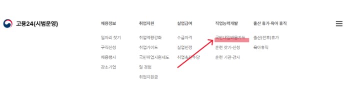 위 메뉴에서 국민내일배움카드를 찾은 후 클릭합니다.