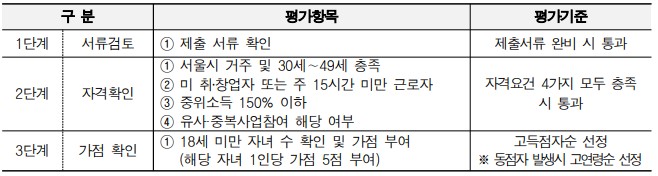 서울시 거주, 미취·창업여성으로서 가구소득 기준 중위소득 150% 이하인 자(유사·중복사업 동시 및 순차 참여 미해당자)