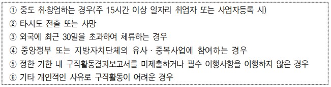 | (신청 이후 ~ 선정 이전 중도취․창업시) 구직지원금 미지급, 취·창업성공금 미지급 (선정 이후 ~ 1차 지원금 지급 전 중도취․창업시) 지급전 필수이행사항 이행 시 구직지원금 지급, 취·창업성공금 미지급(1차 결과보고서 제출 필수) |
